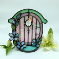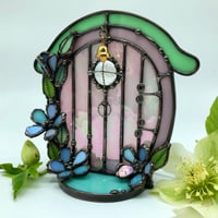 Pretty pastel blue flowers and buds climb around a beautiful iridescent pink door
