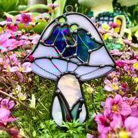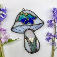 A stained glass mushroom incorporating a beautiful blue harebell flower