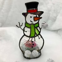 A cute snowman candle holder. Made from opaque, clear and iridescent art glass.