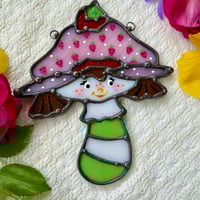 A stained glass Strawberry Shortcake inspired Mushroom Suncatcher